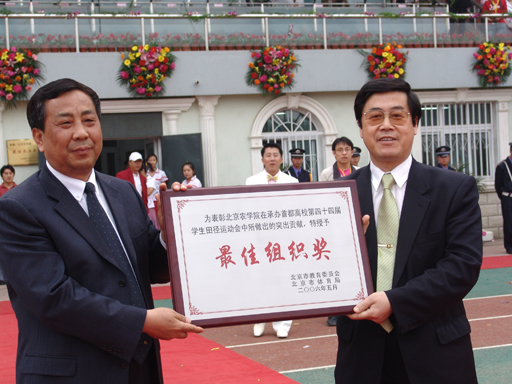 北京市教委副主任杜松彭向院长王有年颁发了“最佳组织奖”奖牌。