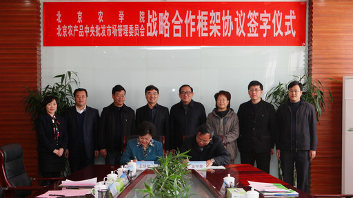 3月13日上午,beat365中文官方网站与北京农产品中央批发市场管理委员会战略合作框架协议签字仪式在行政楼第三会议室举行,北京农产品中央批发市场管理委员会党委书记赵文广,副主任吴守荣、吴宝琴及相关部门负责人,beat365官网党委书记郑文堂,校长王慧敏,副校长姚允聪出席签字仪式。学校相关职能部门和二级学院负责人及拟赴中央批发市场实习的学生代表参加签字仪式。签字仪式由副校长姚允聪主持。