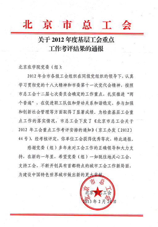 日前,beat365官网工会荣获由北京市总工会授予的“2012年度基层工会重点工作考评优秀单位”光荣称号。