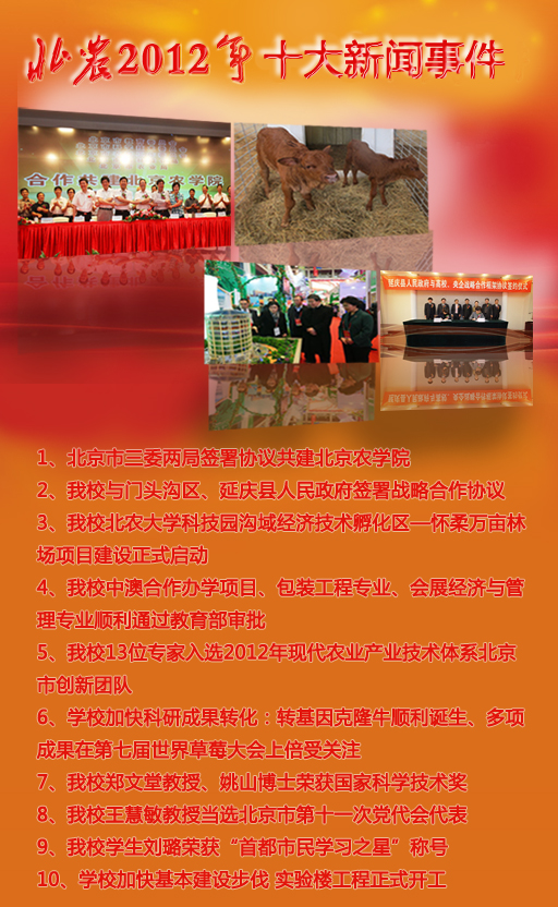 2012年,在全校师生的共同努力下,学校在教学、科研、社会服务、人才培养等方面取得了显著成绩。2013年,学校正式启动“更名工程”,前景令人鼓舞,使命催人奋进。2013年我们要立足自身、精诚团结、努力拼搏,借助社会各界方方面面的力量,全面落实学校各项工作,为2015年各项指标全面逼近“更名大学”标准、学校全面建设都市型现代农林大学做出应有的贡献!