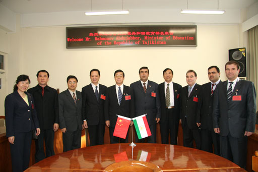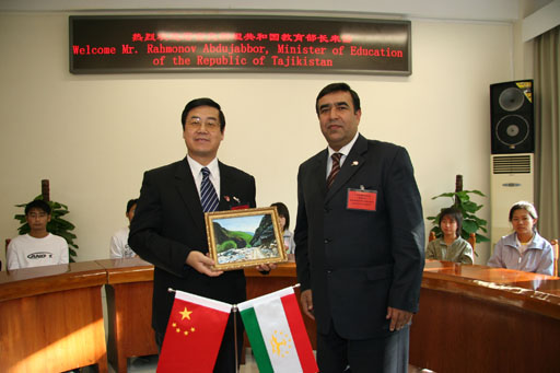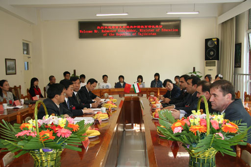 10月19日下午,秋高气爽,阳光明媚,塔吉克斯坦共和国教育部部长拉赫莫诺夫•阿布杜扎波尔(Rahmonov Abdujabbor)及随行人员对beat365官网进行了访问。院长王有年、副院长杜晓林热情接待了阿布杜扎波尔部长一行。