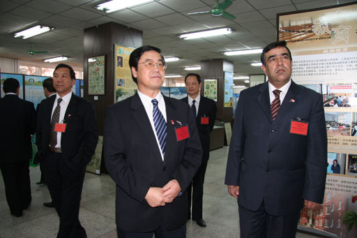塔吉克斯坦共和国教育部部长拉赫莫诺夫•阿布杜扎波尔(Rahmonov Abdujabbor)及随行人员与院长王有年、副院长杜晓林一同参观了校史展和友谊林。