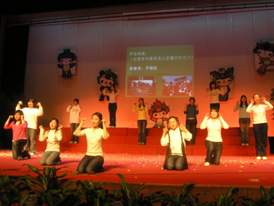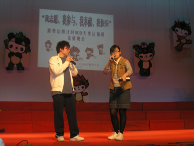 晚上8点零8分,在场师生用倒计时的方式共同迎来了奥运会开幕式倒计时500天,手语社表演的手语歌曲《志愿者的微笑是北京最好的名片》将本次知识竞猜晚会推向高潮!青年志愿者协会还真专门为奥运献上了他们精心准备的配乐诗朗诵《同叠纸鹤,共迎奥运》,他们用亲手叠制的500多只纸鹤表达了迎接奥运的热情及对奥运的深深祝福。