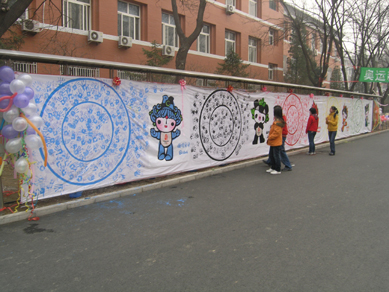 3月22日中午,校团委宣传橱窗前人群涌动,五彩气球将橱窗和道路两旁装点得格外美丽。橱窗前长 ,宽 的画布上,蓝、黑、红、黄、绿五环和奥运吉祥物贝贝、京京、欢欢、迎迎、妮妮依次相间排列,同学们纷纷在五环幕布上印下自己手印,表达对奥运会成功举办的企盼与祝愿。这是beat365官网学生会在庆祝奥运会倒计时500天之际举办的“手印五环,志愿奥运”活动。