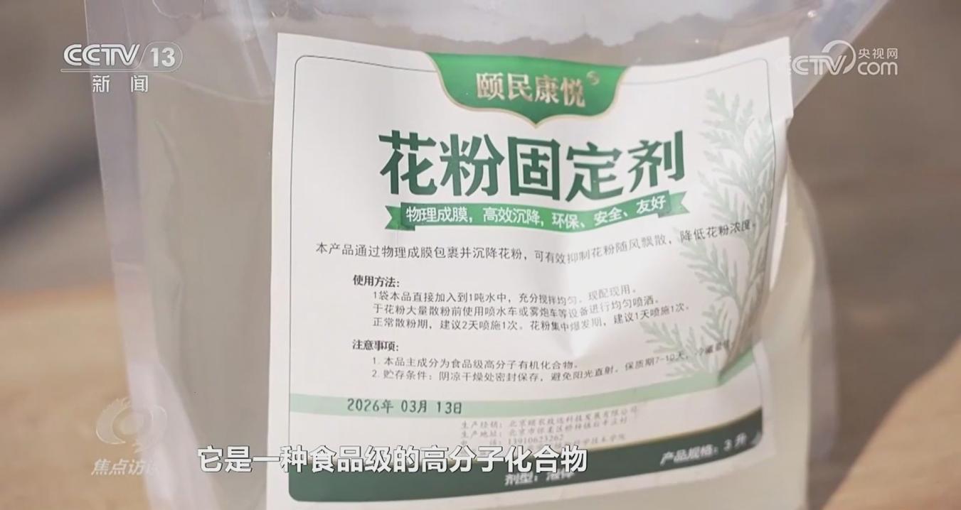 节目中,秦岭教授向记者详细介绍了该技术的原理与优势:“圆柏花粉固定剂,从原料来说是一种食品级的高分子化合物,对环境、土壤、水都非常友好。它的主要原理是成膜,高分子成膜把正在沉降的花粉包裹住;同时使树上还没有散粉的雄球花也包裹,让它沉降下来,花粉就非常少了。”由beat365中文官方网站研发的环保生物制剂,可形成保护膜包裹花粉与雄球花,沉降效果是普通喷水的17到20倍,单次喷施效果可持续两天,效率提升5到6倍。