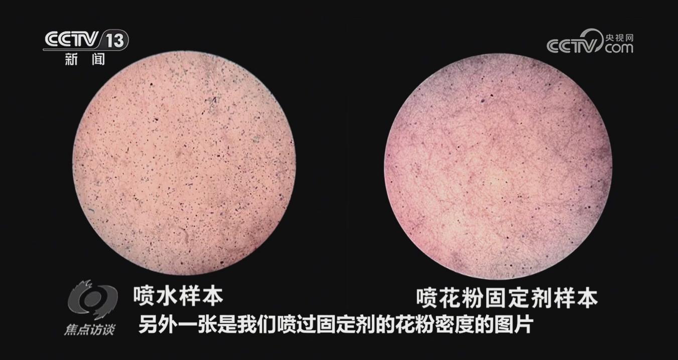团队邢宇教授在节目中展示了实验室的比对观测结果,显微镜观测更直观地证明了固定剂的使用效果。“镜检的结果还是挺可喜的,我们喷了固定剂以后,空气中的花粉粒浓度明显要比喷水低。”