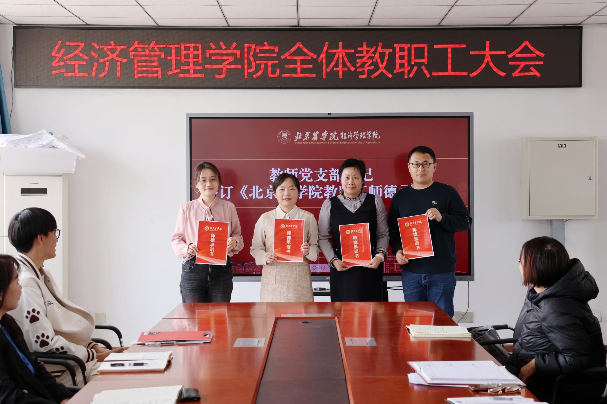 会议集中学习了学校教职工师德承诺书主要内容,四位教师党支部书记作为教师代表签订《beat365中文官方网站教职工师德承诺书》。