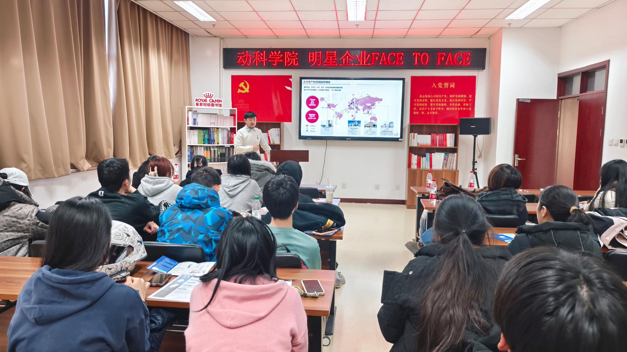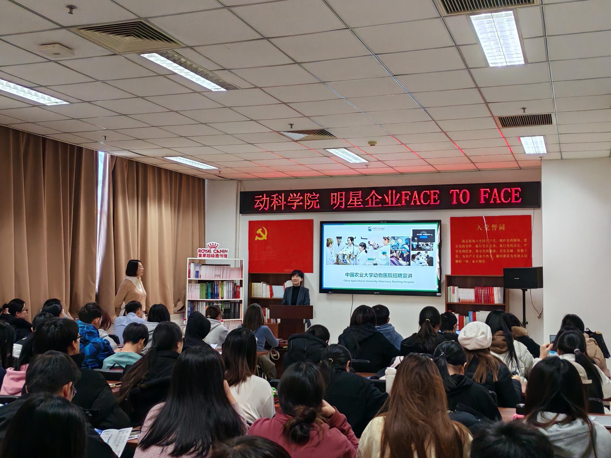 李格宾向同学们介绍了中国农业大学动物医院的特色和发展方向,招聘岗位及要求,新入职人员未来职业路径规划,向全体毕业生发出邀请函。朱佳解析中国宠医职业新优势和新机遇,介绍了新瑞鹏集团的优势亮点。任毅向同学们介绍了北京卡尤迪生物科技股份有限公司新一代全自动分子诊断机器人的研发和应用,鼓励毕业生到长三角地区的分公司工作。