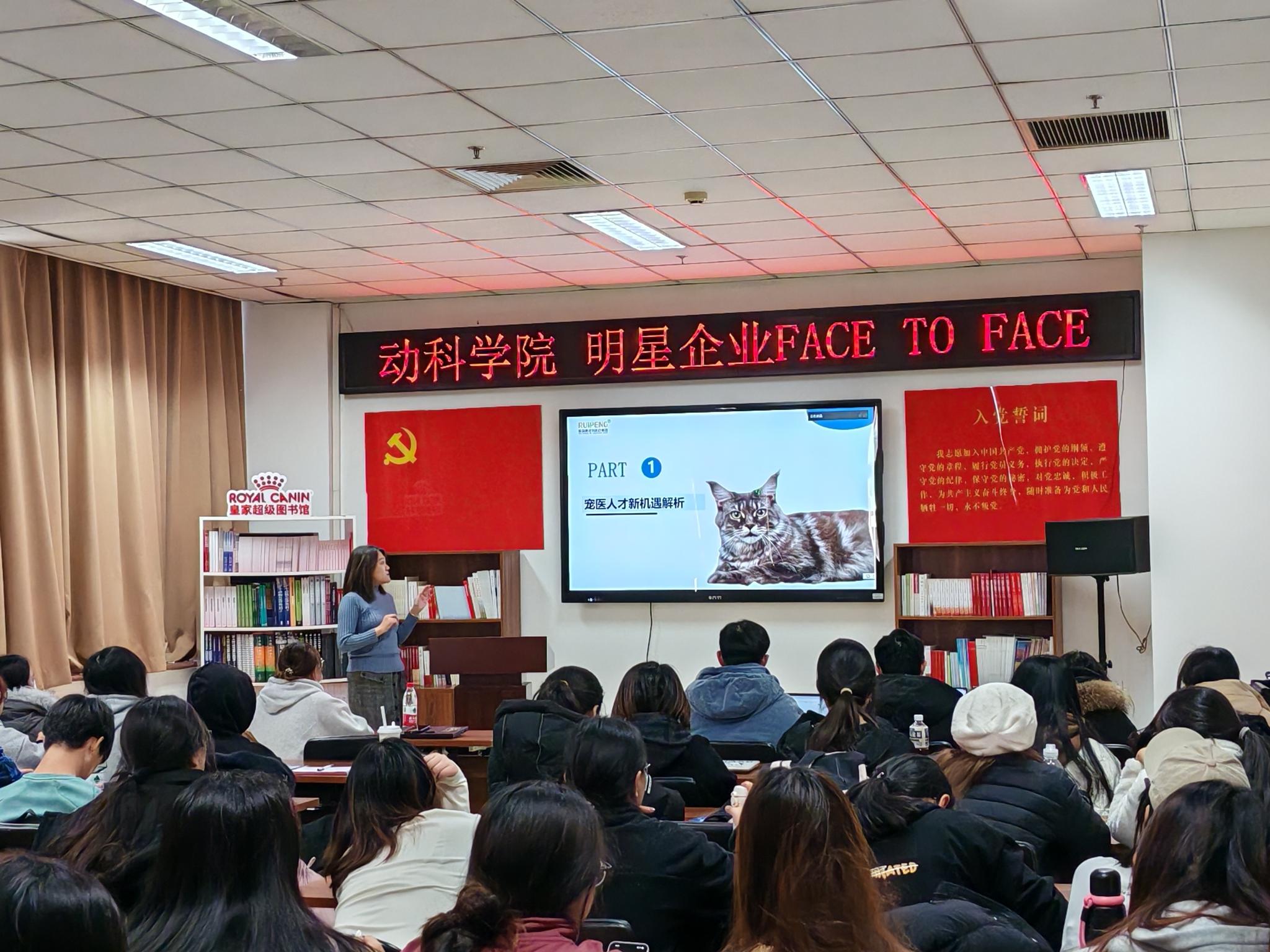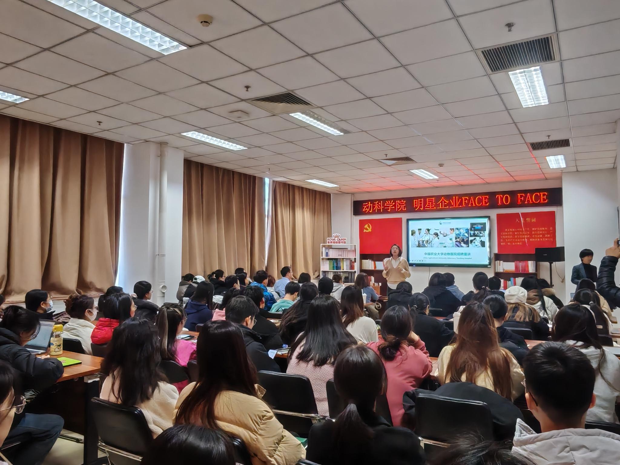 1月3日,动物科学技术学院举办2025年首场明星企业面对面活动,邀请中国农业大学动物医院、新瑞鹏宠物医疗集团、北京卡尤迪生物科技股份有限公司三家企业负责人与学生面对面交流,结合当前就业形势,勉励同学们树立正确的就业观和择业观,做好职业规划。