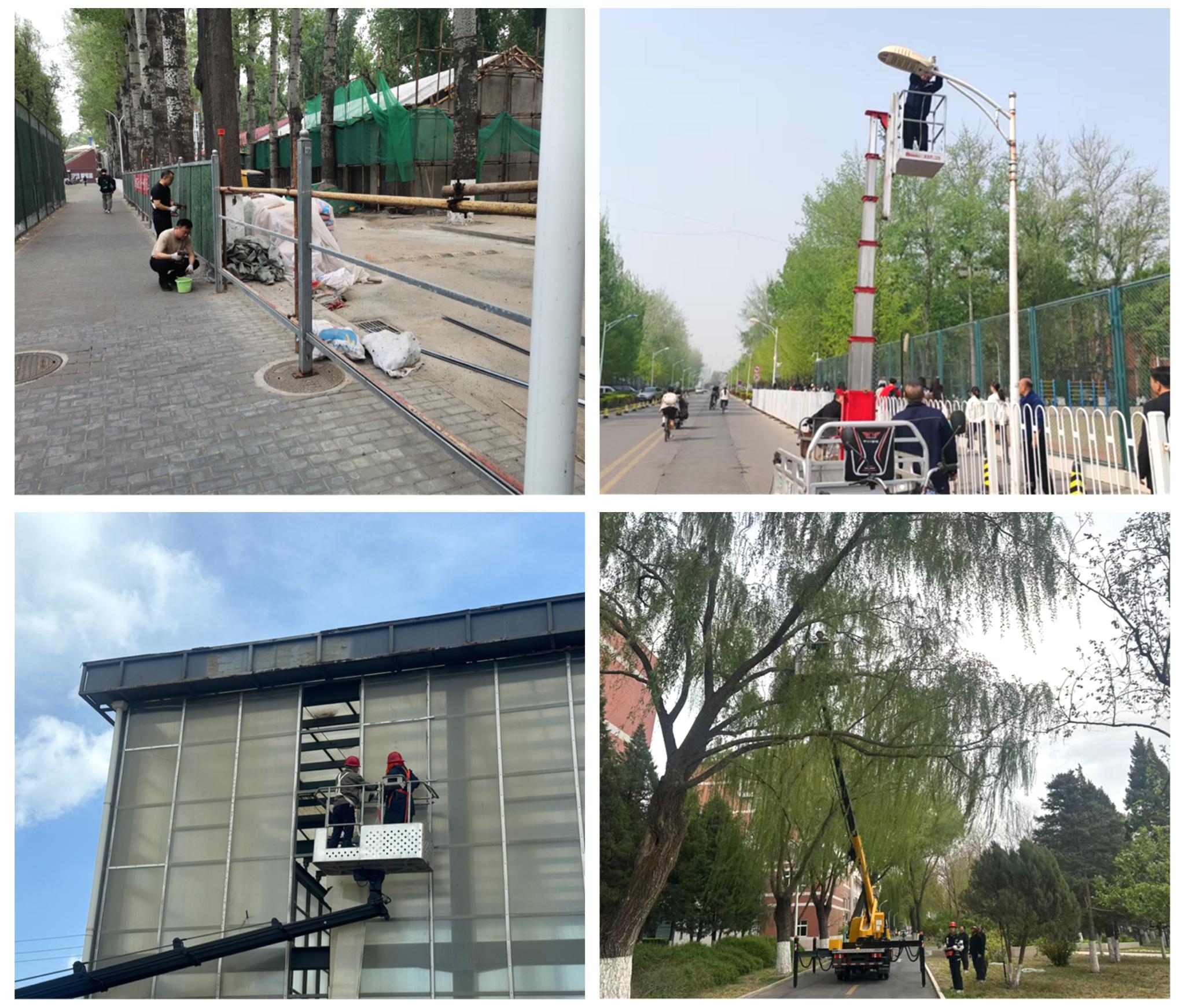后勤基建处全体工作人员全面落实工作部署会要求,暂停一切户外施工作业,采取必要断电措施,拆除施工围挡。转移楼宇周边展板、告示牌,加固垃圾桶、灯杆、空调外机等室外设施。修剪隐患树木,排查架空线路隐患。食堂、商超做好食品储备。升降车、运输车辆随时待命。对大风造成的树枝折断、温室墙面受损状况,在做好安全防护基础上,进行现场研判、科学处置,以最快速度处理完毕,防止伤及行人和进一步的财产损失。