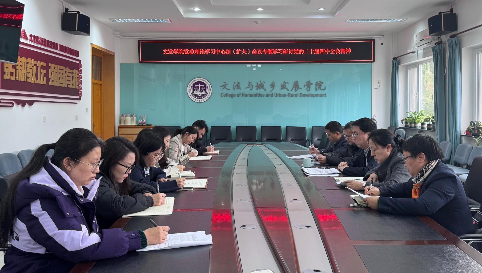 10月29日,文法与城乡发展学院召开党委理论学习中心组(扩大)会议,专题学习研讨党的二十届四中全会精神。会议由文发学院党委书记赵和文主持。