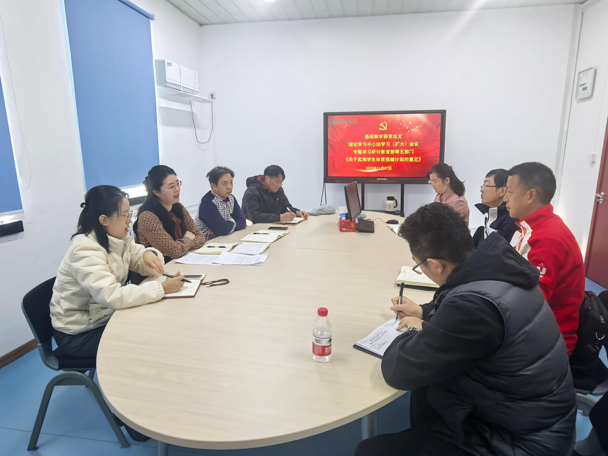近日,教育部等五部门联合印发《关于实施学生体质强健计划的意见》(以下简称《意见》),提出学生体质强健计划“二十条”举措,对深化学校体育综合改革进行系统部署。为深入贯彻习近平总书记关于教育、体育的重要论述和全国教育大会精神,基础教学部党总支理论学习中心组召开学习(扩大)会议,学习研讨《意见》,探讨落实措施。会议由党总支书记牟玉荣主持,理论学习中心组成员、体育教研室相关老师参加会议。