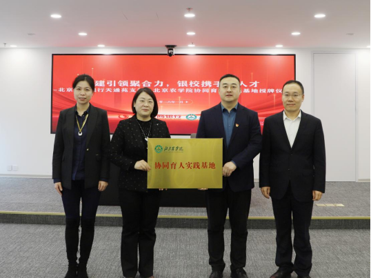 李健介绍了北京农商银行天通苑支行的基本情况,并对学院在人才输送、平台共建等方面给予的支持表示感谢。他表示,支行愿与学院继续深化在知农爱农新型人才培养、农业新业态案例开发、创新创业教育及学生实习实践等方面的合作,大力推进产教融合,积极探索金融人才培养的新模式与新路径,共同打造产学研用紧密结合的实践基地,开创共赢发展新局面。