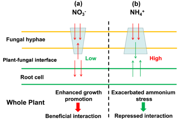 内容:介绍非损伤微测技术在根部内生真菌调控宿主对无机氮素形式适应性研究中的应用。在高NH4+条件下,共生真菌定殖根系表现出显著增加的NH4+积累和外排,类似于NH4+水平升高引起的“铵毒”表型。真菌在与宿主根部相互作用过程中排出了NH4+,从而导致在高NH4+条件下植物-真菌界面处的NH4+水平增加。研究揭示了内生真菌枫香拟茎点霉通过影响根系-菌丝交界面NO3-/NH4+的离子动态调控宿主拟南芥对不同氮素形式的响应。