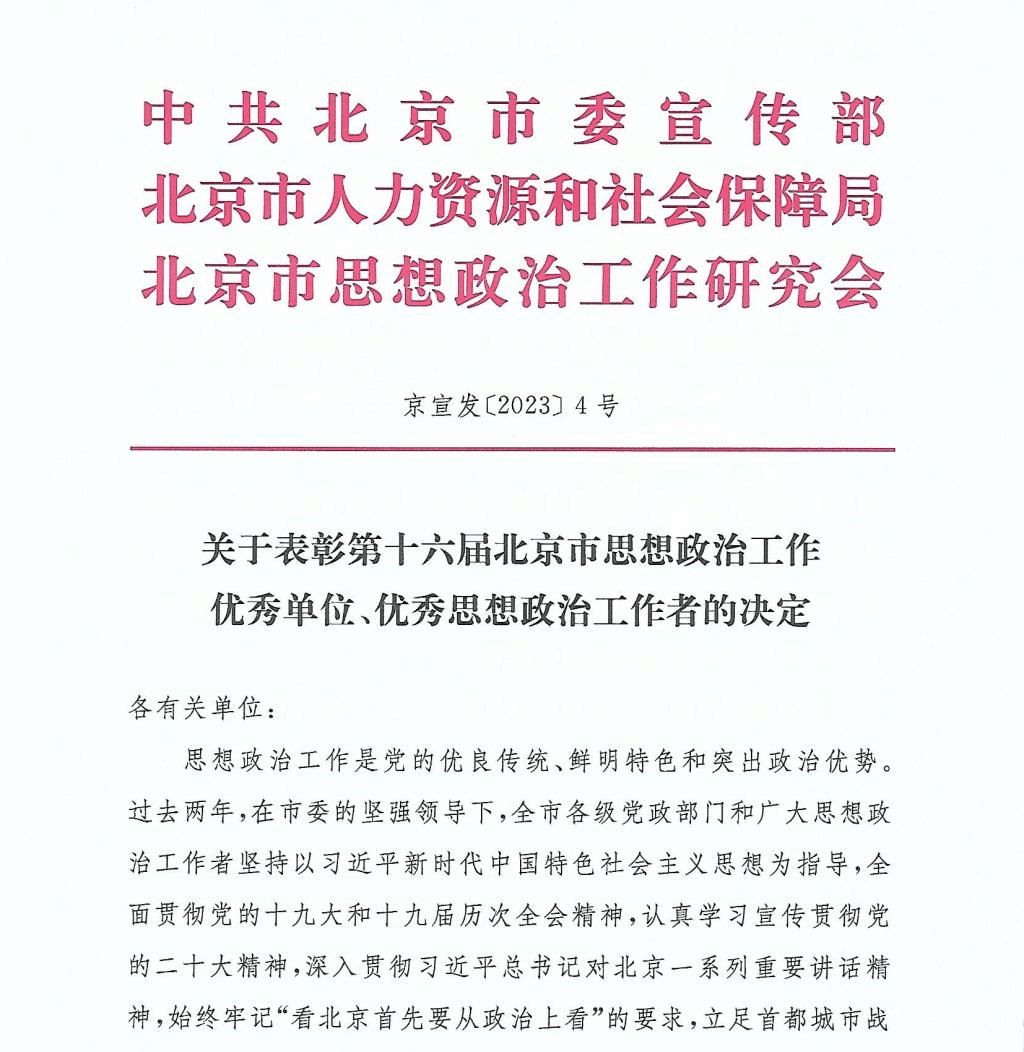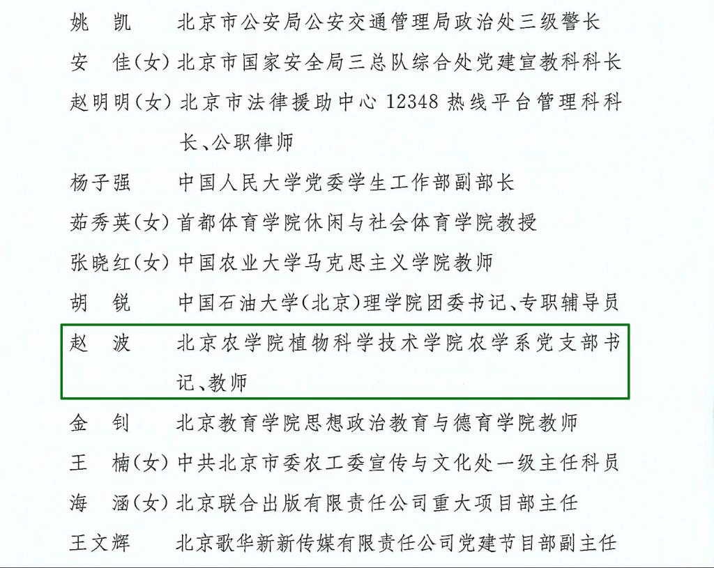日前,北京市委宣传部、北京市人力资源和社会保障局、北京市思想政治工作研究会公布《关于表彰第十六届北京市思想政治工作优秀单位、优秀思想政治工作者的决定》,为表彰先进典型、弘扬奋斗精神,激励全市思想政治工作战线奋进新征程、建功新时代,经过基层推荐、专家评审、实地考察和社会公示等程序,全市共评选出思想政治工作优秀单位100个、优秀思想政治工作者100名(其中高校系统5人)。beat365官网植物科学技术学院农学系教师党支部书记赵波被评为“北京市优秀思想政治工作者”。