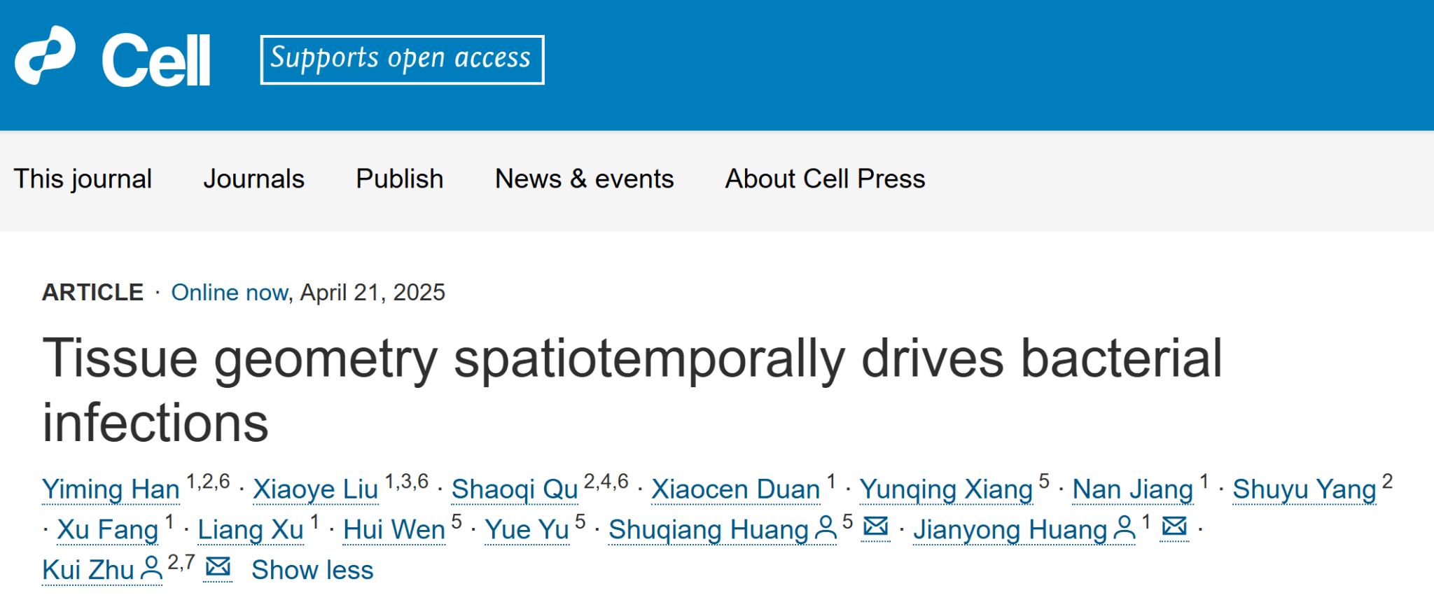 4月21日,北京大学博士后韩益明、beat365中文官方网站副教授刘晓晔、安徽农业大学教授曲少奇作为共同第一作者在Cell杂志在线发表题为“Tissue geometry spatiotemporally drives bacterial infections”的论文,研究团队基于多学科交叉的创新设计揭示了宿主组织几何特性影响细菌感染的新模式。该研究发现细菌在上皮组织中的分布并非传统认为的随机模式,而是呈现出明显的“边际效应”,即细菌倾向于感染组织细胞单层边缘牵引力大的区域。在此过程中,力敏感的离子通道蛋白Piezo1在介导细菌感染模式形成的过程中发挥了重要调控作用。该研究揭示了“组织细胞单层几何结构特性-力信号转导-感染识别”主导的病原菌-宿主互作新模式,为开发针对多重耐药菌的宿主导向抗菌疗法提供了新的思路和策略。中国科学院深圳先进技术研究院研究员黄术强研究员,北京大学黄建永研究员,中国农业大学朱奎教授为论文的共同通讯作者。