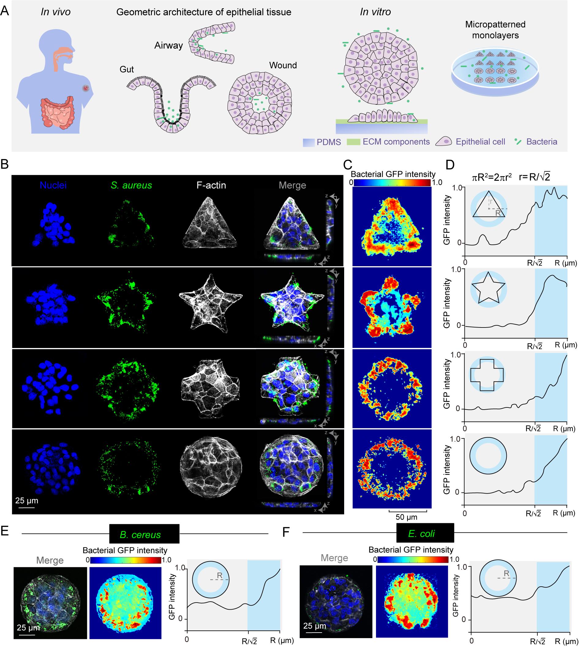 关于细菌和宿主细胞相互作用的研究通常在非限制的上皮单层内进行,且细菌在上皮单层上的分布模式默认为是随机的。该研究打破了传统认为细菌感染是随机分布的观点,表明宿主细胞单层的结构特性对细菌感染的空间分布具有重要调控作用。研究者们基于微纳加工技术构建了具有不同几何结构的上皮单层模型,观察到多种病原菌均在感染初期呈现出边缘分布模式,即呈现出细菌感染的“边际效应”(图1)。该感染模式不受细胞类型、细胞单层尺寸和基底修饰方法等因素的调控,而是与组织细胞单层的致密度相关,即细菌感染主要发生在致密细胞单层的边缘。