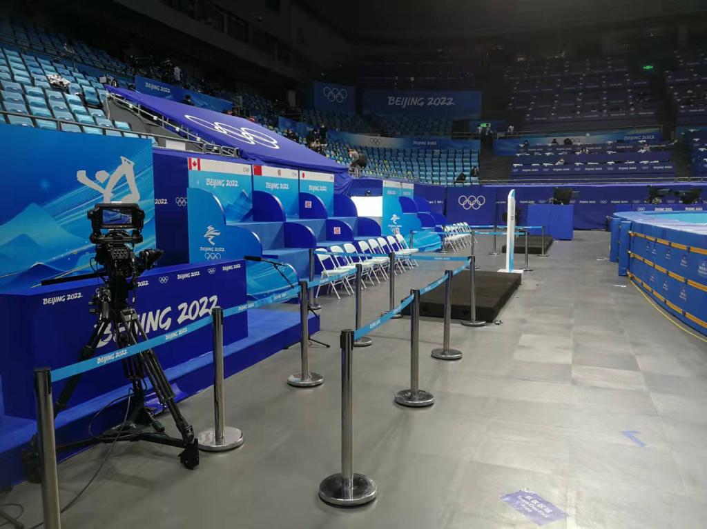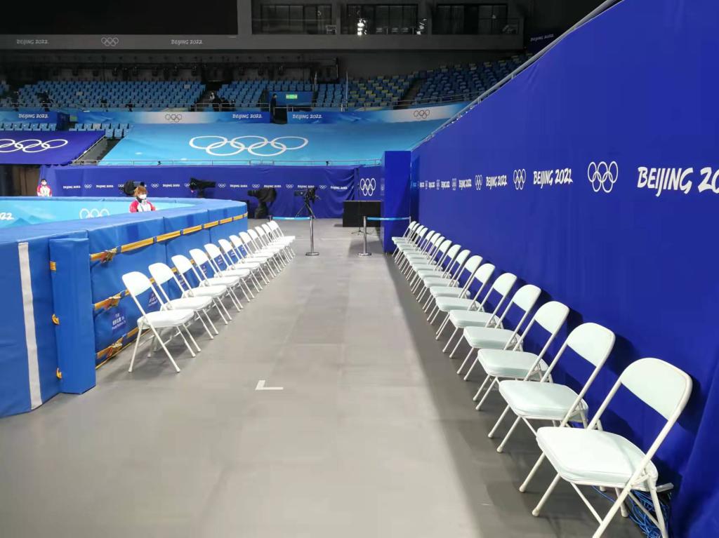 除了检查防护垫,逯合江还负责短道速滑比赛场地和花样滑冰比赛场地的转换工作。冬奥会期间,花样滑冰和短道速滑两个项目比赛均在首都体育馆内举行,需要完成30次场地转换。“我们负责场地转换时收回桌椅及时消毒,并以最快速度将裁判长、副裁判长、弯道管理员、内检区、外检区、发令区、记圈台、运动员下冰区、冰车进场口等区域的桌椅和一米栏摆放好。”每次转场涉及冰面、防护垫、景观、摄影点位、转播机位、计时计分、临时设施等多个环节,需多个业务领域、约200人密切配合,在2小时内全部完成。“每一场比赛背后都有很多人在默默工作,虽然每个人的力量有限,但团结协作的力量很强大。”逯合江骄傲地说。