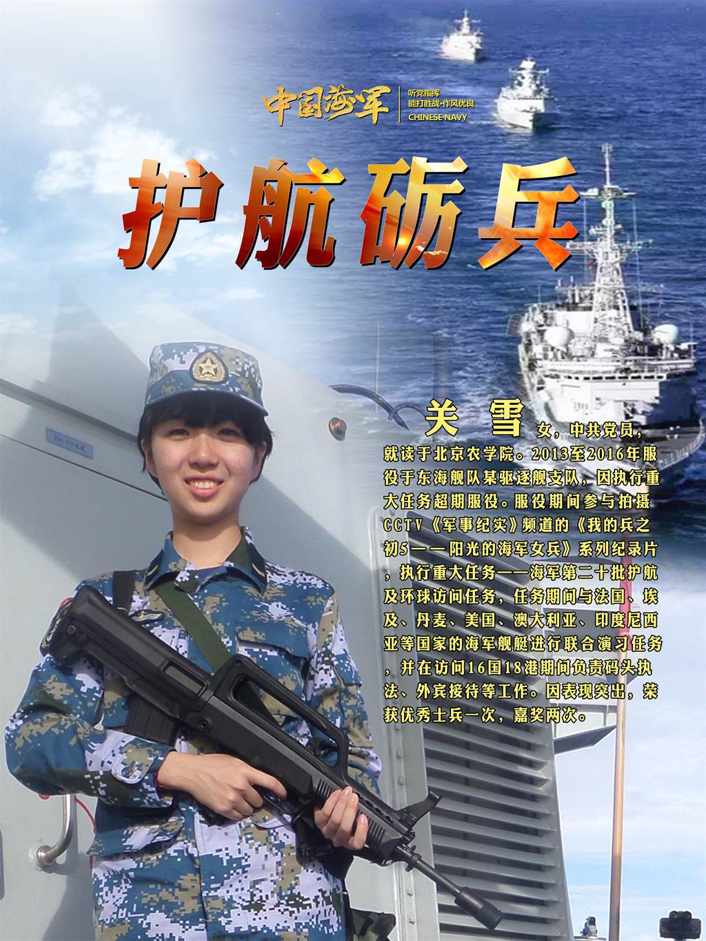 关雪说:“两年半的军旅岁月是我人生长河中不可磨灭的回忆,我很自豪把最美好的青春献给祖国。我也非常荣幸,能够见证中国海军挺进深蓝,切身感受到祖国的繁荣昌盛。站在建党百年的历史节点上,我愿以退伍军人的身份坚守全心全意为人民服务的宗旨,不忘使命,勇于担当,在新的岗位上继续发光发热。”