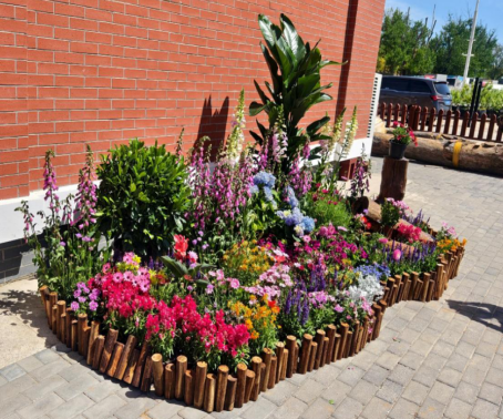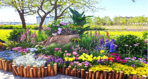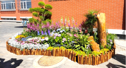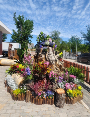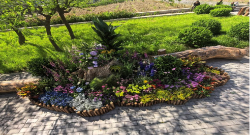 第八组花镜主题为“繁英绮梦”。花镜以丰富多样花卉打造。高低错落植株,色彩斑斓花朵,如粉色、紫色、蓝色等交相辉映,营造出繁花似梦之景。木桩围边质朴自然,与植物融合,增添野趣。中央大型绿植如点睛之笔,提升层次感。整体营造出绮丽梦幻氛围,既展现植物自然之美,又给人带来视觉享受与心灵放松。