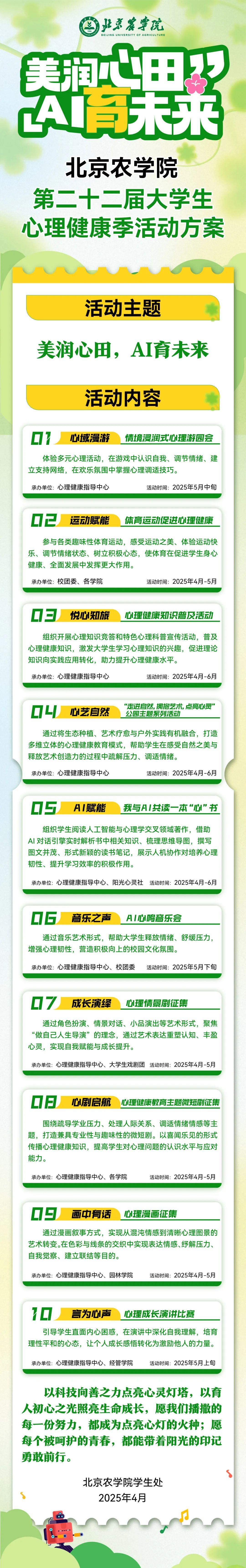 一图读懂|beat365中文官方网站“美润心田 AI育未来”第二十二届大学生心理健康季活动方案