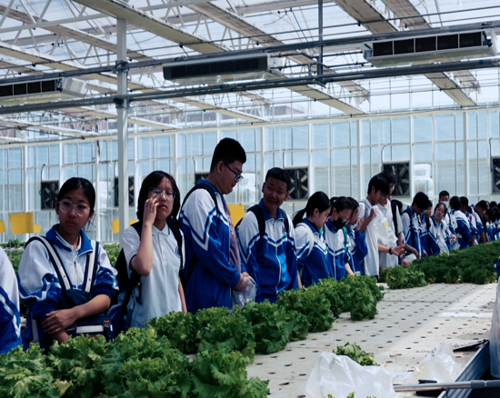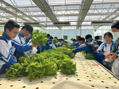 走进6000平方米的智能连栋温室,水培架上层层叠叠的奶油生菜、紫背天葵构成“多彩菜园”。蔬菜学指导教师现场揭秘:营养液自动循环系统通过物联网实时监测EC值、pH值,确保每株作物获得精准养分。学生们亲手采摘成熟度达标的蔬菜。“原来不用土壤也能种菜,还能节省大量的水!”初二学生在实践手册上认真写下观察结论。这场融合生物知识、数据传感与劳动操作的沉浸式教学,让抽象的智慧农业概念变得触手可及。