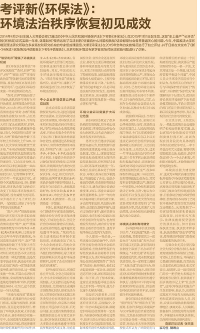 2014年4月24日全国人大常委会修订通过的《中华人民共和国环境保护法》(下称新《环保法》),自2015年1月1日起生效。这部“史上最严”“长牙齿”的《环保法》正式实施一年来,效果如何?是否达到了立法目的?还面临什么问题和挑战?这些都是社会各界普遍关心的问题。今年,中国政法大学环境资源法研究所联合多家高校和研究机构的专家组成课题组,对新《环保法》在2015年全年的实施情况进行了独立评估,并于日前在京发布了《新< 环保法>实施情况评估报告》(下称《评估报告》),众多知名环境法专家学者现场对新法实施问题进行了诊断。