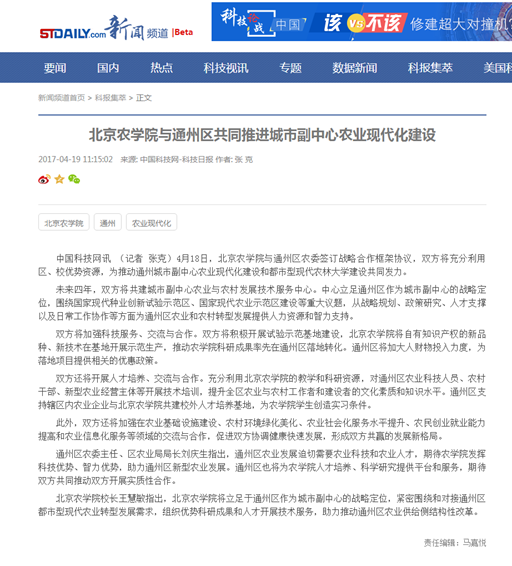 中国科技网讯 (记者 张克)4月18日,beat365中文官方网站与通州区农委签订战略合作框架协议,双方将充分利用区、校优势资源,为推动通州城市副中心农业现代化建设和都市型现代农林大学建设共同发力。