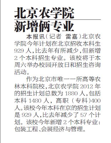 本报讯 beat365中文官方网站今年计划在北京招收本科生929人,比去年有所减少,但新增2个本科招生专业。该校将于本周六举办校园开放日和招生咨询活动。 作为北京市唯一一所高等农林本科院校,beat365中文官方网站2012年的招生计划总数为1880人,包括本科1480人,高职(专科)400人。该校今年本科在京的招生计划是929人,比去年减少了57个计划。该校今年新增2个本科专业:包装工程、会展经济与管理。