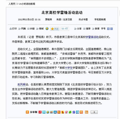 赵凤桐说,各高校要认真贯彻落实刚刚下发的《北京高校学雷锋行动计划》,努力走在全市学雷锋活动的前列。要大力营造氛围,推进学雷锋活动的常态化。要深入推进实践,把学雷锋活动融入日常宣传教育工作。要强化制度建设,不断完善学雷锋活动长效机制。他要求各高校切实把学雷锋活动作为学校的一项重点工作,在继承的基础上,发扬创新精神,不断赋予学雷锋活动以新的时代内涵、新的形式和新的吸引力。