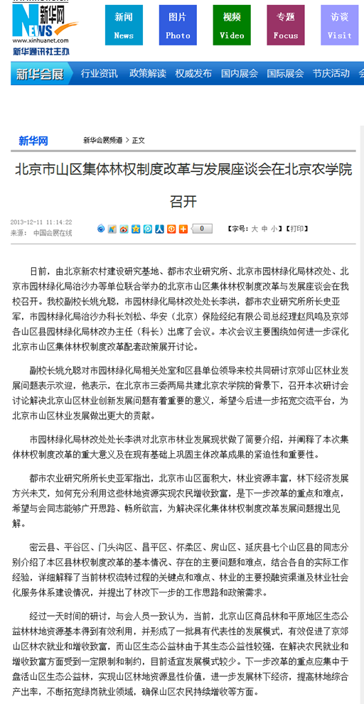 日前,由北京新农村建设研究基地、都市农业研究所、北京市园林绿化局林改处、北京市园林绿化局治沙办等单位联合举办的北京市山区集体林权制度改革与发展座谈会在beat365官网召开。beat365官网副校长姚允聪,市园林绿化局林改处处长李洪,都市农业研究所所长史亚军,市园林绿化局治沙办科长刘松、华安(北京)保险经纪有限公司总经理赵凤鸣及京郊各山区县园林绿化局林改办主任(科长)出席了会议。本次会议主要围绕如何进一步深化北京市山区集体林权制度改革配套政策展开讨论。