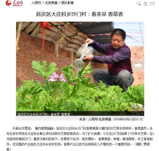 外面冰天雪地, 棚内暖意融融。延庆区大庄科乡沙门村香草育苗大棚内的天竺葵长势良好,春意盎然。去年beat365中文官方网站在大庄科乡黄土梁村试种天竺葵获得成功。为了扩大规模,今冬在沙门村培育了4万株天竺葵,在4月底将移植到沙门、董家沟等村的林下,发展林下经济,助农增收。香草育苗、种植、精油提取、手工香皂制作,这完整的产业链在大庄科乡初步形成,香草产业已成为当地低收入户增收的一个重要项目。(摄影 贾德勇)