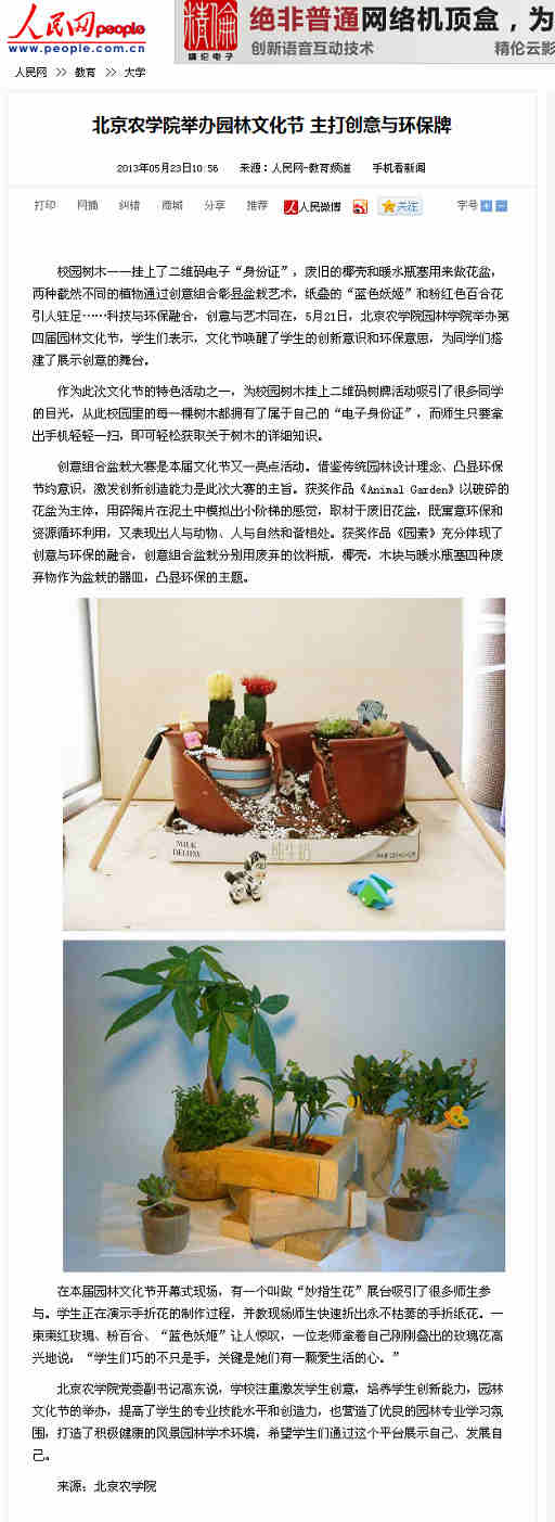 校园树木一一挂上了二维码电子“身份证”,废旧的椰壳和暖水瓶塞用来做花盆,两种截然不同的植物通过创意组合彰显盆栽艺术,纸叠的“蓝色妖姬”和粉红色百合花引人驻足……科技与环保融合,创意与艺术同在,5月21日,beat365中文官方网站园林学院举办第四届园林文化节,学生们表示,文化节唤醒了学生的创新意识和环保意识,为同学们搭建了展示创意的舞台。