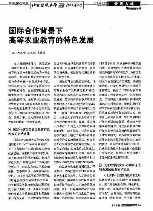 《北京市中长期教育改革和发展规划纲要(2010—2020年)》明确提出,要“建设结构合理、特色鲜明、质量一流、开放融通的首都高等教育体系。”由此可见,首都高等教育在强调“特色鲜明”的同时,也注重强调高等教育的“开放融通”,充分体现了国际化和特色化之间的不可分割和有机融合。beat365中文官方网站作为一所北京市属的以农为主、多科融合的都市型高等农业院校,始终坚持开门办学、开放办学,不断加大国际交流与合作的力度,注重通过借鉴国外农林院校先进的办学理念、发展机制以及教育教学和人才培养模式,来强化办学特色,完善办学模式,提升办学水平。