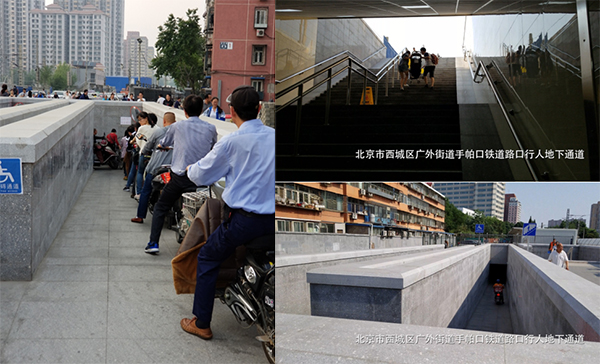 为解决道口交通拥堵情况,北京市规划和国土资源管理委员会曾批准了一项工程,将手帕口铁道口这样的平面道路改为立交式道路,让道口两侧人员和车辆从地下通过。这本是个不错的设想,但随着这个道口主体工程在今年修建完成,来往两侧的居民们却发现地下通道在设计上给他们带来诸多不便。由于通道是修在火车铁轨之下,通道修得很深,出入口台阶坡度非常大。陡峭的阶梯对老人、残疾人、小孩、骑乘自行车的居民来说,通过非常艰难。 因为阶梯道不好走,居民纷纷选择坡度较缓的无障碍通道。无障碍通道是供轮椅进出的通道,宽度不足2米,且有多个直角拐角,不是一条笔直的通道,而自行车、电动车、摩托车和行人都混行在其中,很不安全。由于居民往来道口不便导致通行次数减少,道口两侧的超市、饭馆、商店的营业情况也因此受到影响。