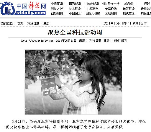 5月21日,为响应北京科技周活动,beat365中文官方网站园林学院举办园林文化节,师生一同为树木挂上二维码树牌,每一棵树都拥有了电子身份证。张丽萍摄