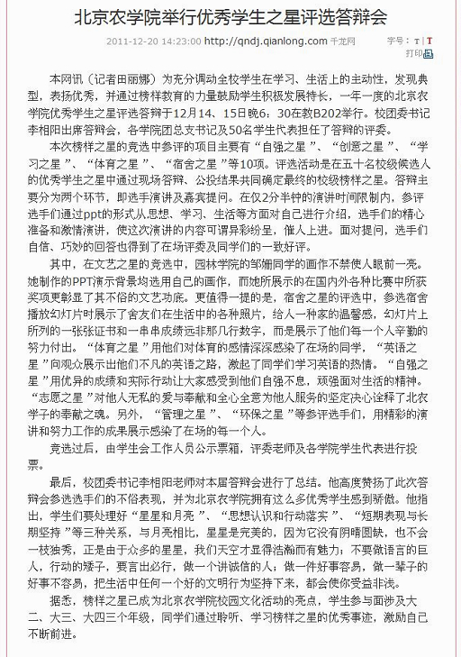 其中,在文艺之星的竞选中,园林学院的邹姗同学的画作不禁使人眼前一亮。她制作的PPT演示背景均选用自己的画作,而她所展示的在国内外各种比赛中所获奖项更彰显了其不俗的文艺功底。更值得一提的是,宿舍之星的评选中,参选宿舍播放幻灯片时展示了舍友们在生活中的各种照片,给人一种家的温馨感,幻灯片上所列的一张张证书和一串串成绩远非那几行数字,而是展示了他们每一个人辛勤的努力付出。“体育之星”用他们对体育的感情深深感染了在场的同学,“英语之星”向观众展示出他们不凡的英语之路,激起了同学们学习英语的热情。“自强之星”用优异的成绩和实际行动让大家感受到他们自强不息,顽强面对生活的精神。“志愿之星”对他人无私的爱与奉献和全心全意为他人服务的坚定决心诠释了北农学子的奉献之魂。另外,“管理之星”、“环保之星”等参评选手们,用精彩的演讲和努力工作的成果展示感染了在场的每一个人。