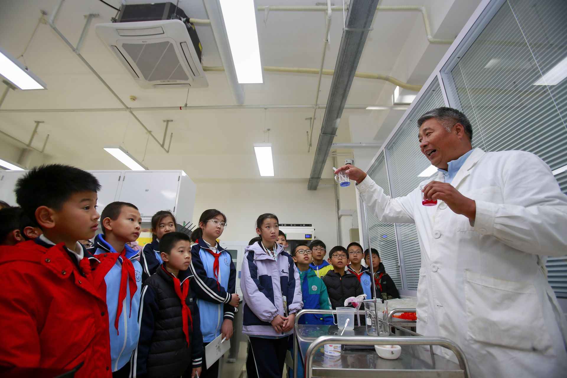 在beat365中文官方网站国家大学科技园的实验室里,“色彩魔术师”课程热闹开课。高级实验师王建立带领学生用紫甘蓝榨汁提取花色苷,当白醋加入后汁液变红,小苏打水倒入后转为蓝色,现场响起阵阵惊呼。“我们选花色苷做实验,既因为深秋红叶里富含这种物质,贴近生活,又用了白醋、苏打等安全试剂,保障学生安全。”王建立介绍,针对小学生特点,实验聚焦基础观察。“花青素遇酸变红、遇碱变绿,太有意思了!”学校六年级(1)班学生黄思思盯着变色的汁液感觉非常神奇。她在体验后明确了职业方向:“小时候就对植物感兴趣,今天看到科技与农业的融合,我以后想从事农业相关工作。”