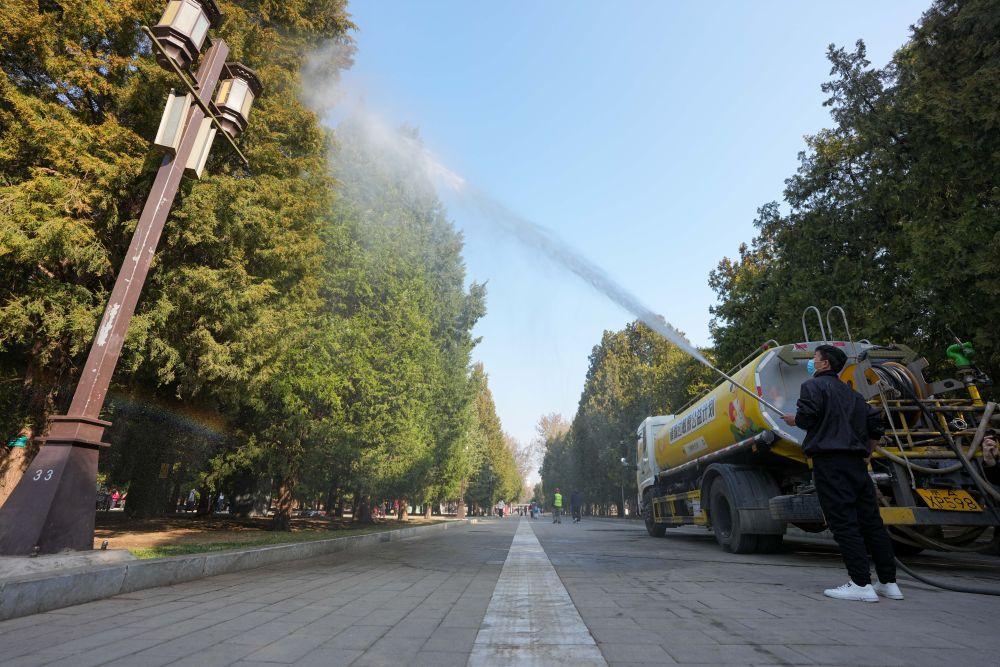 15日上午,记者走进地坛公园。喷灌车隆隆作响,园林工人手持水枪,正对着一排排圆柏喷淋。与往年不同,这次水里添了“新料”。