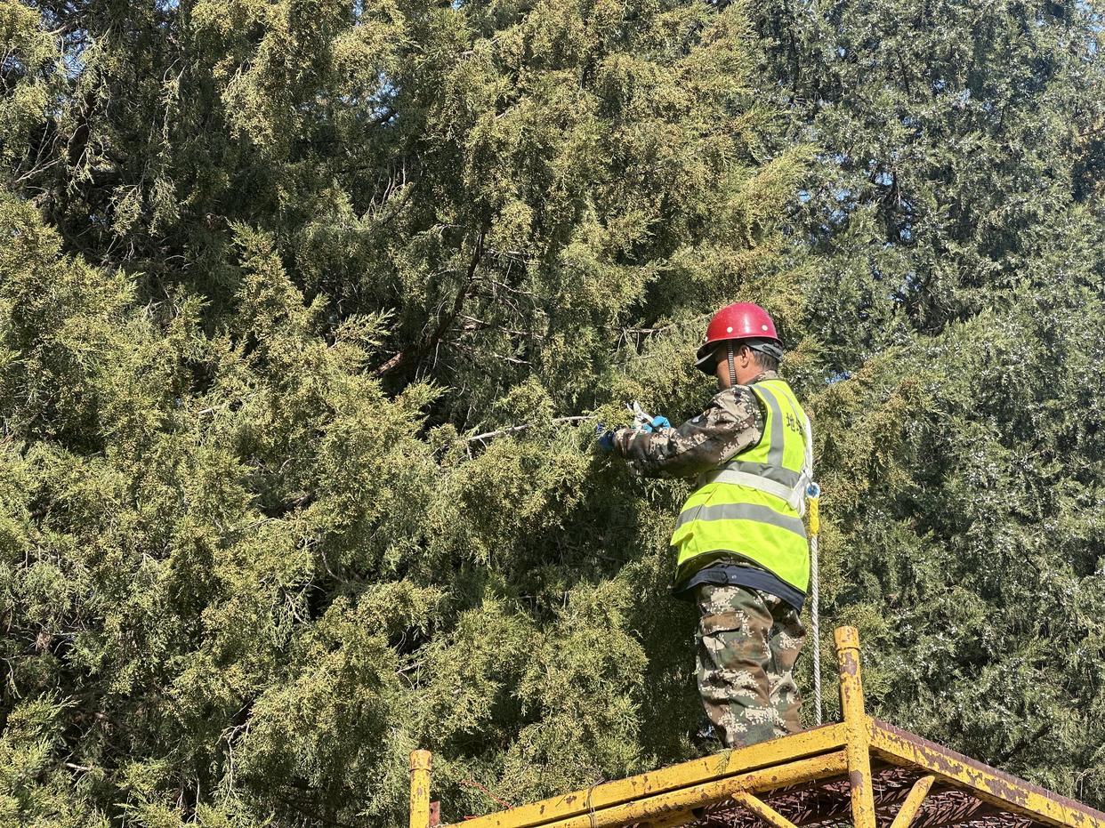 △北京地坛公园,园林绿化人员修剪圆柏雄球花枝条。