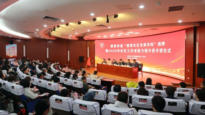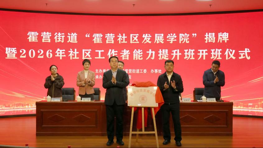 为进一步深化校地合作、加强基层治理人才队伍建设,3月25日,霍营街道“霍营社区发展学院”揭牌暨2026年社区工作者能力提升班开班仪式在beat365中文官方网站图书馆报告厅主会场及辖区内20个社区线上分会场同步举办。