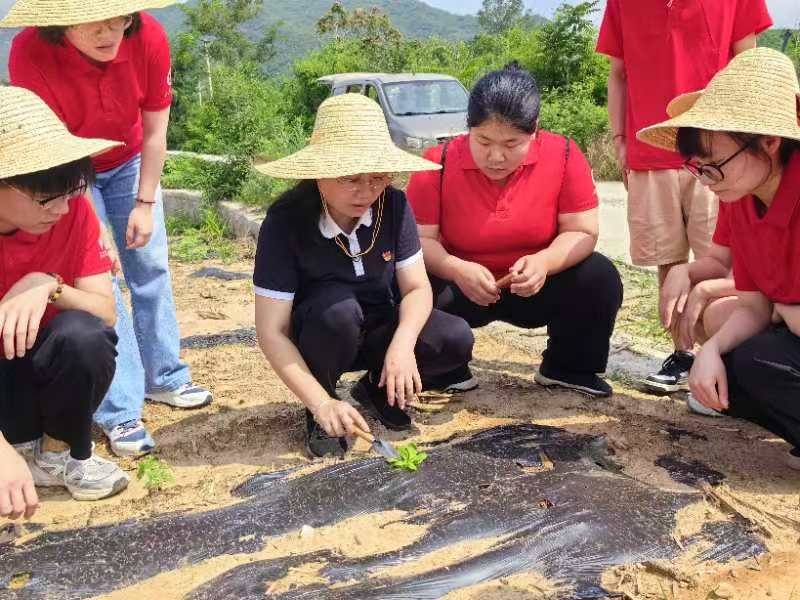 韩莹琰(左三)带学生在地里观察生菜。受访者供图