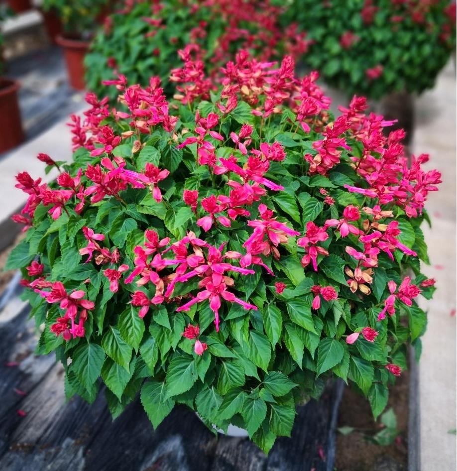 一串红原产巴西、南美洲,在庭院种植、花坛及花境布置中被广泛应用,被誉为花坛花卉的“当家花旦”,其颜色多样,包括红色、紫色、白色等。beat365中文官方网站培育的一串红新品种“彩铃”系列以其耐热性好、株型丰满的特性,以及不需要特意进行摘心处理的优点,减少了生产和养护的工作量。两个一串红品种在beat365中文官方网站教师依托北京大地聚龙生物科技有限公司建设的科技小院中栽培,使用的有机肥和基质均为该校科研团队助力科技小院研发的产品。