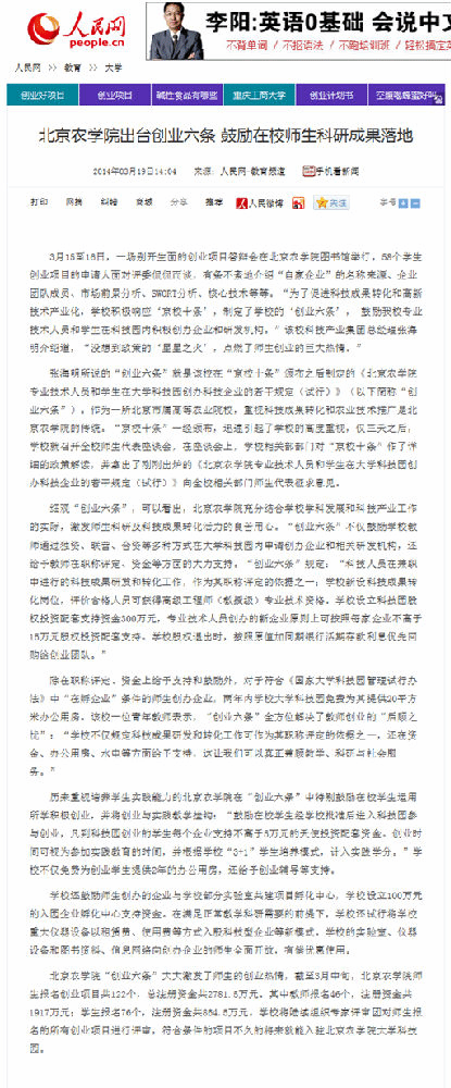 张海明所说的“创业六条”就是该校在“京校十条”颁布之后制定的《beat365中文官方网站专业技术人员和学生在大学科技园创办科技企业的若干规定(试行)》(以下简称“创业六条”)。作为一所北京市属高等农业院校,重视科技成果转化和农业技术推广是beat365中文官方网站的传统。“京校十条”一经颁布,迅速引起了学校的高度重视,仅三天之后,学校就召开全校师生代表座谈会,在座谈会上,学校相关部部门对“京校十条”作了详细的政策解读,并拿出了刚刚出炉的《beat365中文官方网站专业技术人员和学生在大学科技园创办科技企业的若干规定(试行)》向全校相关部门师生代表征求意见。