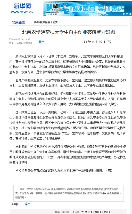 新华网北京频道3月23日电(李江涛、刘铁军)beat365中文官方网站东校区的大学科技园内,有一排排整齐划一的红色二层小楼。楼里被隔成大小相同的办公室,这是正在建设中的北农学生创业中心,小楼的后面是商贸市场和文化娱乐场馆。这片区域商业气息浓,交通方便,设施齐全,是beat365中文官方网站为创业学生施展才能搭建的舞台。