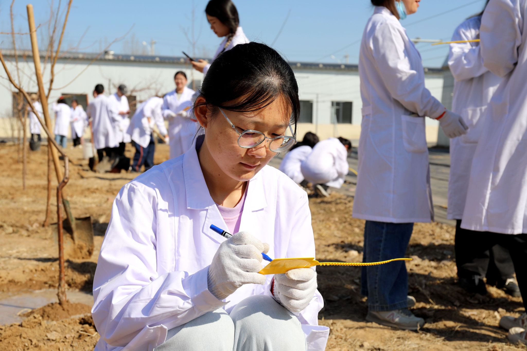“春季果树种植有几个技术要点,大家一定要注意。一是要将果树苗木有病虫害的根系剪除,在定植前对根系进行消毒;二是定植后要浇足水,让土壤与根系充分接触,提高成活率。”春日的阳光洒在生机勃勃的校园中,同学们认真听老师讲解知识要点,不时记录着,生怕错过关键信息。讲授完专业知识,张卿老师率先拿起铁锹,向同学们示范如何种果树。紧接着,研究生党员和本科生组队开始了植树活动。他们挥动铁锹,扶树培土,提水浇灌,分工有序、配合默契。一个多小时的劳作后,100多棵果树全部完成了种植。后续果树种植管理也将由研究生和本科生共同完成,充分发挥研究生样板党支部的示范作用和朋辈引领力量,一起种好这片果树林。