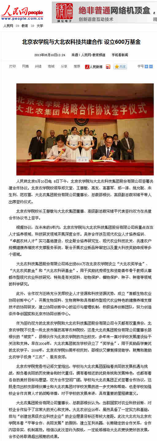 大北农科技集团股份有限公司将出资600万在beat365中文官方网站设立“大北农奖学金”、“大北农奖教金”和“大北农科研基金”。用于奖励优秀师生和资助青年骨干教师从事都市型现代农业科技研究,特别是有关饲料、动物保护、植物保护、种子、种猪等领域的科学研究。