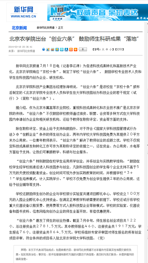 据介绍,作为北京市属高等农业院校,重视科技成果转化和农业技术推广是beat365中文官方网站的传统。“创业六条”不仅鼓励学校教师通过独资、联营、合资等多种方式在大学科技园内申请创办企业和相关研发机构,还给予教师在职称评定、资金等方面的支持。