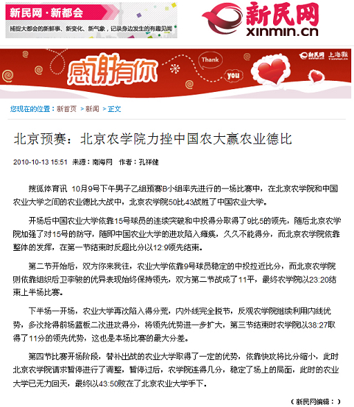 搜狐体育讯 10月9号下午男子乙组预赛B小组率先进行的一场比赛中,在beat365中文官方网站和中国农业大学之间的农业德比大战中,beat365中文官方网站50比43战胜了中国农业大学。