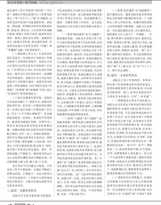 高校办公室作为学校的综合管理和协调部门,发挥着承上启下、联系左右、沟通内外的桥梁和枢纽作用,是学校领导的参谋助手,是综合协调和处理学校事务把手、是为学校发展和广大师生员工提供服务的能手。高校办公室队伍建设也必须主动适应高教形势发展和要求,不断加强自身建设,改进和提高服务水平,开创工作新局面。